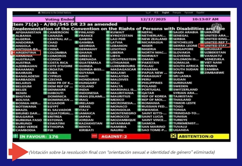 Finalmente, la resolución fue aprobada por 176 votos a favor y 2 votos en contra de Argentina y los Estados Unidos. Aunque el texto continúa manteniendo otros términos como “salud sexual y reproductiva” que expusimos en un artículo anterior que puede ver aquí.