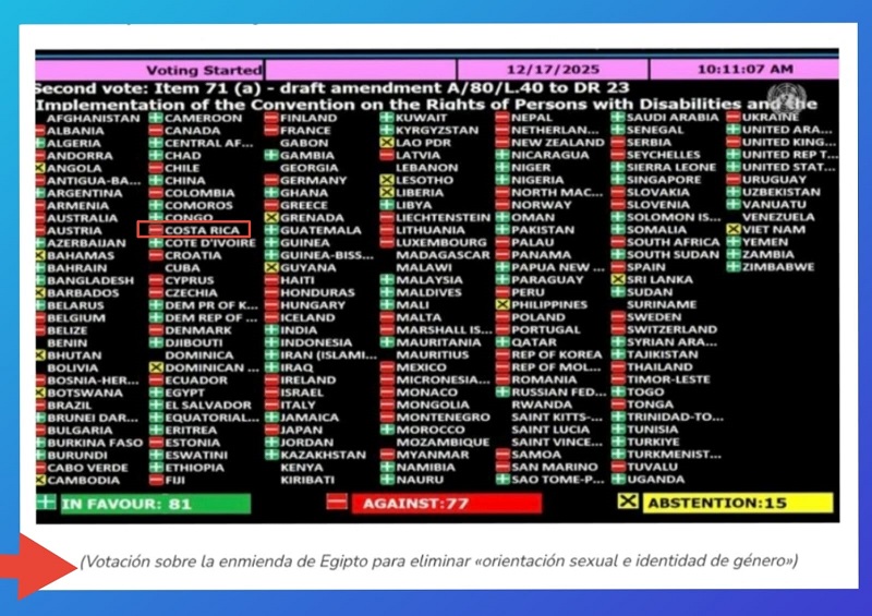 San José, Costa Rica. 18 de diciembre del 2025 -El Conservador CR- Bajo la lupa la política exterior del gobierno Chaves Robles, por reciente votación a una enmienda presentada por Egipto ante la Asamblea General de las Naciones Unidas, en el marco de la implementación de la Convención sobre los Derechos de las Personas con Discapacidad. Dicha enmienda dispuso la eliminación de toda referencia explícita a los términos LGTBIQ del texto de la resolución final. Esto se dio tras una fuerte presión por parte de Egipto y los Estados Unidos.