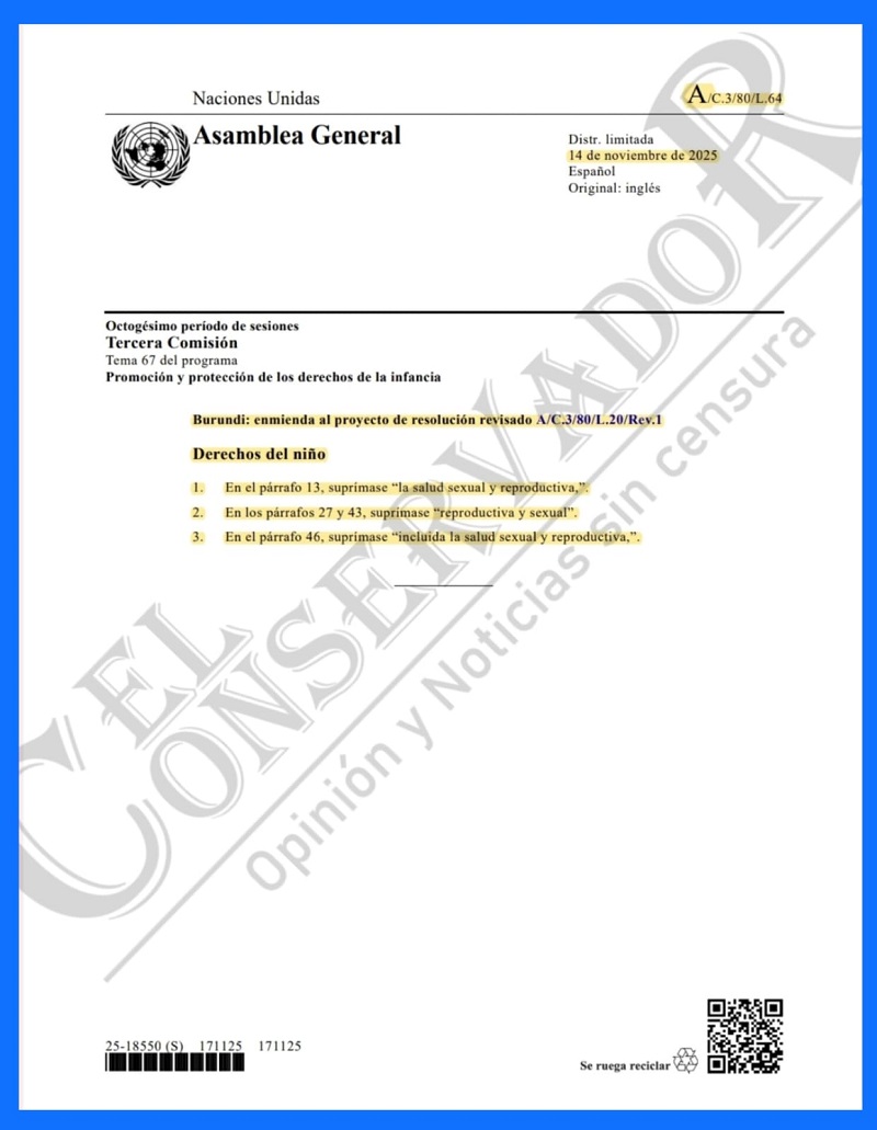 Para este caso en particular, sí hubo una propuesta formal para eliminar ese lenguaje presentada por Burundi. Lo hicieron mediante la enmienda A/C.3/80/L.64, con la que solicitó suprimir todas las referencias a “salud sexual y reproductiva” en los párrafos 13, 27, 43 y 46 del proyecto de resolución mencionado en el primer párrafo. Esa era la oportunidad para que los gobiernos que se dicen provida demostraran coherencia, apoyaran con fuerza y de una buena vez eliminar de raíz cualquier portillo que pueda dar paso al aborto.