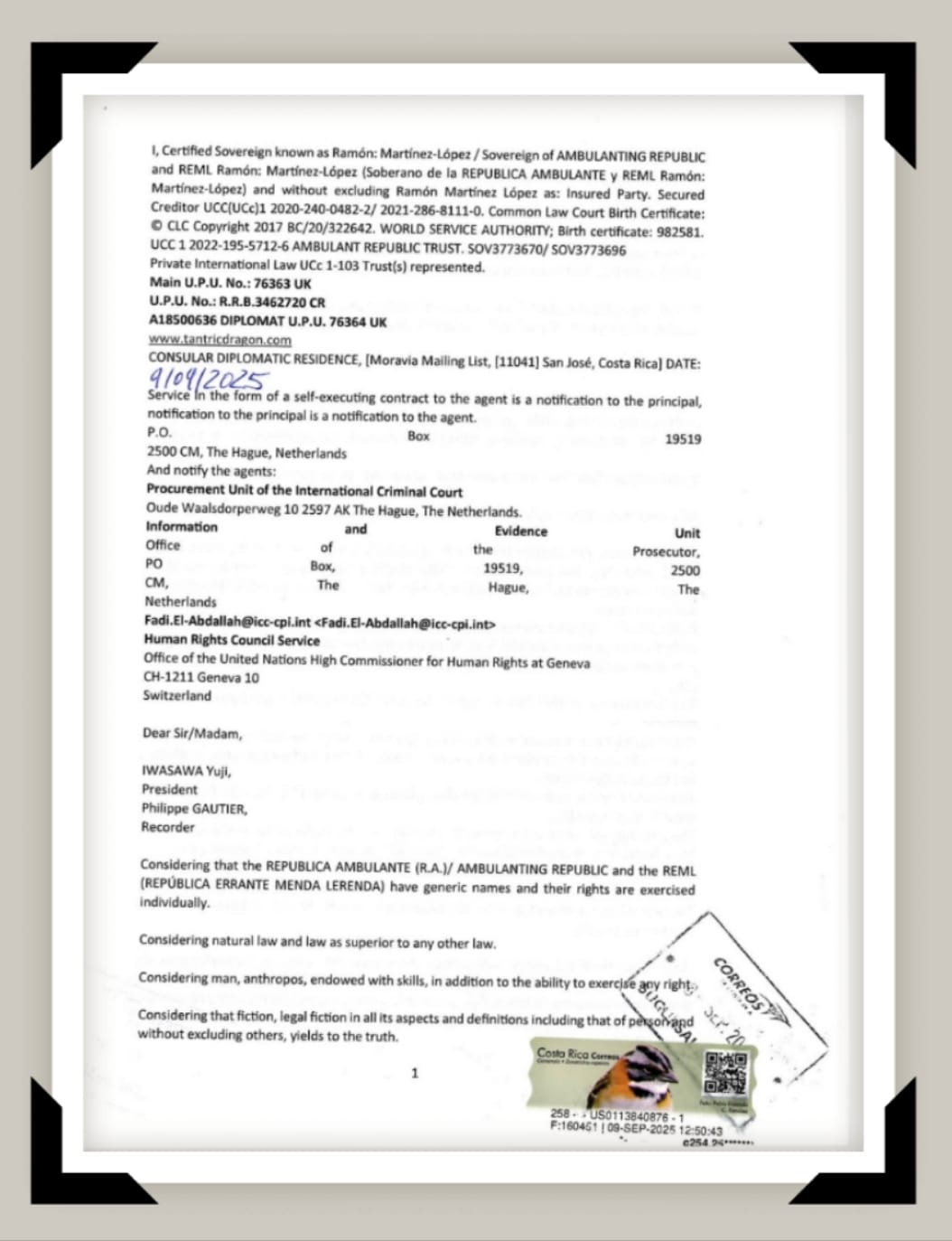 Ramón: Martínez-López, soberano de la REPÚBLICA AMBULANTE ha realizado una denuncia en la Corte Penal Internacional (CPI) contra Estados y entidades registradas como corporaciones, de crímenes contra la humanidad, entre ellos por fraude, corrupción, abuso de poder, esclavitud moderna vía impuestos y registros civiles, violaciones de derechos humanos, vigilancia masiva, intoxicación ambiental, uso indebido de vacunas, y manipulación de la democracia. Se señala la responsabilidad directa de organismos como la OMS, la ONU con su Agenda 2030, considerada un proyecto corporativo para eliminar soberanía e imponer control económico y social.