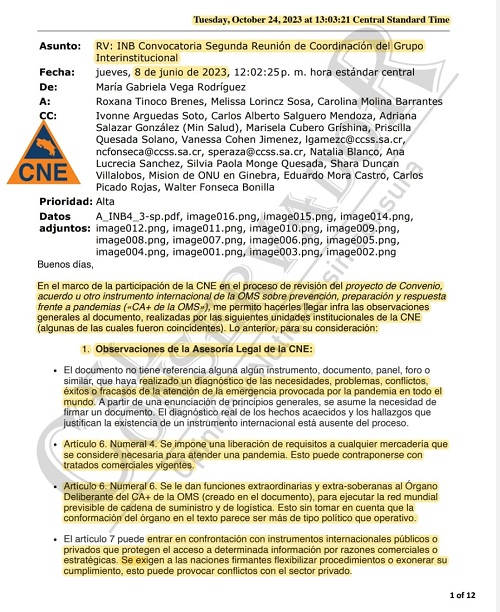 30 de octubre del 2023. San José Costa Rica. El Conservador CR. Hace algunos días un ciudadano preocupado por el país, Marco Albertazzi recibió respuesta de la Comisión Nacional de Emergencias (CNE), como parte de una de las tantas consultas que ha realizado al Ministerio de Salud. En esta ocasión fue con referencia a las implicaciones del Tratado Pandémico para la soberanía sanitaria del país.
