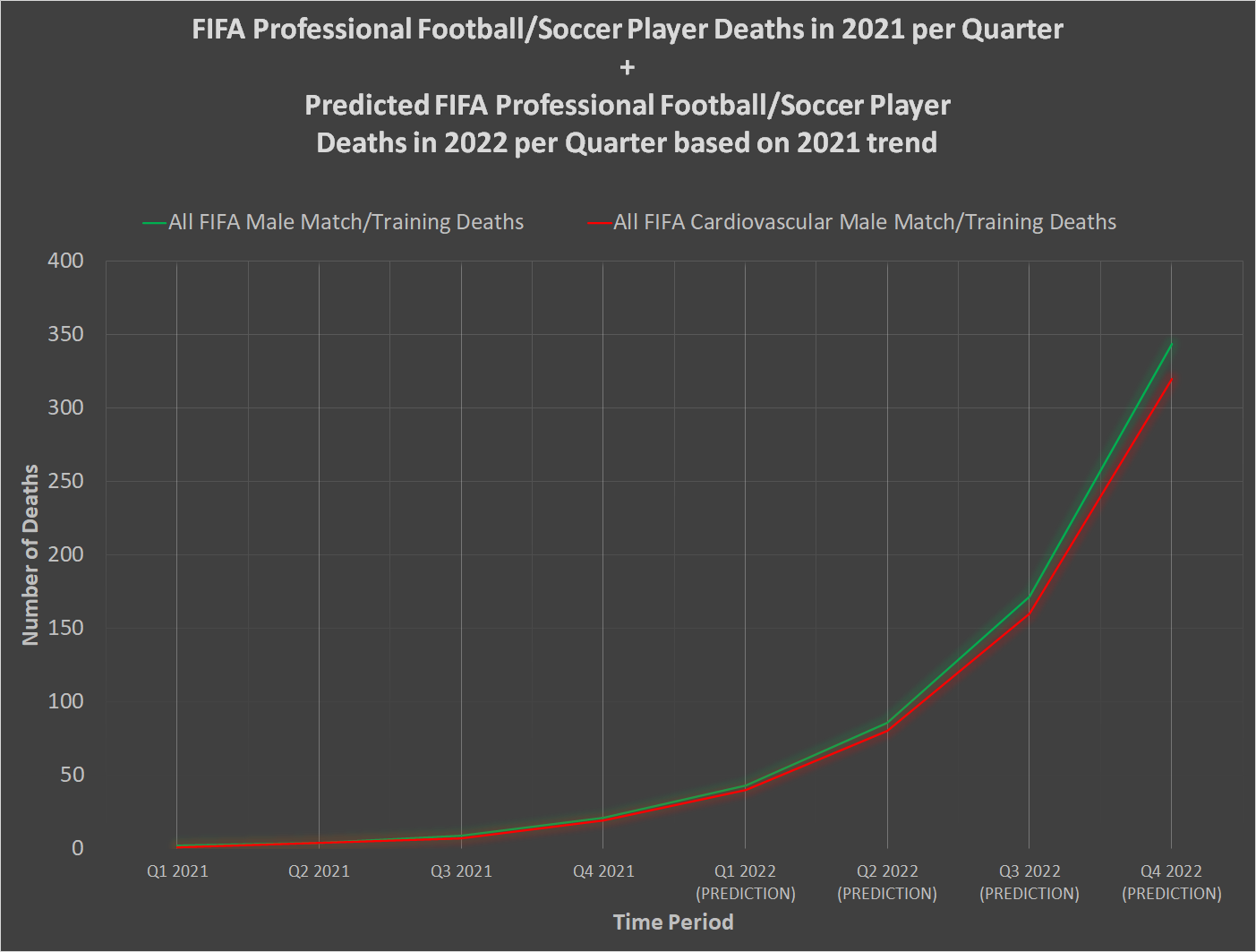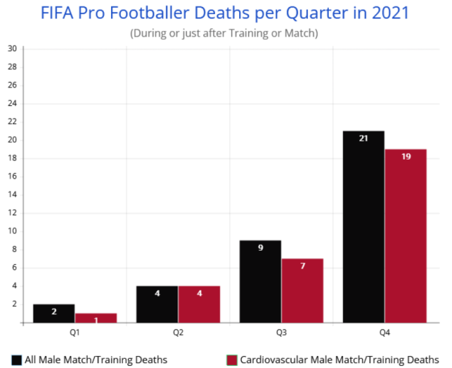 Las muertes cardiovasculares entre los jugadores profesionales de fútbol se duplican cada trimestre. Por lo tanto, para fines de 2022 pueden haber aumentado a 320 por trimestre (40, 80, 160, 320). «El consejo de los expertos a los futbolistas que colapsan pero sobreviven es que deben cesar toda actividad extenuante durante 3 meses.» Estas cifras revelan que todos los atletas que están vacunados contra el Covid-19 deben hacer lo mismo.