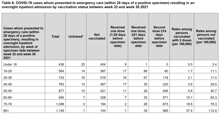 La siguiente tabla está tomada del 'Informe de vigilancia de la vacuna Covid-19 de Public Health England - Semana 36 - 2021', y muestra que entre la semana 32 y la semana 35 de 2021 (cuando Delta era la variante dominante) solo se registraron 404 hospitalizaciones por Covid-19 entre menores de 18 años en Inglaterra.